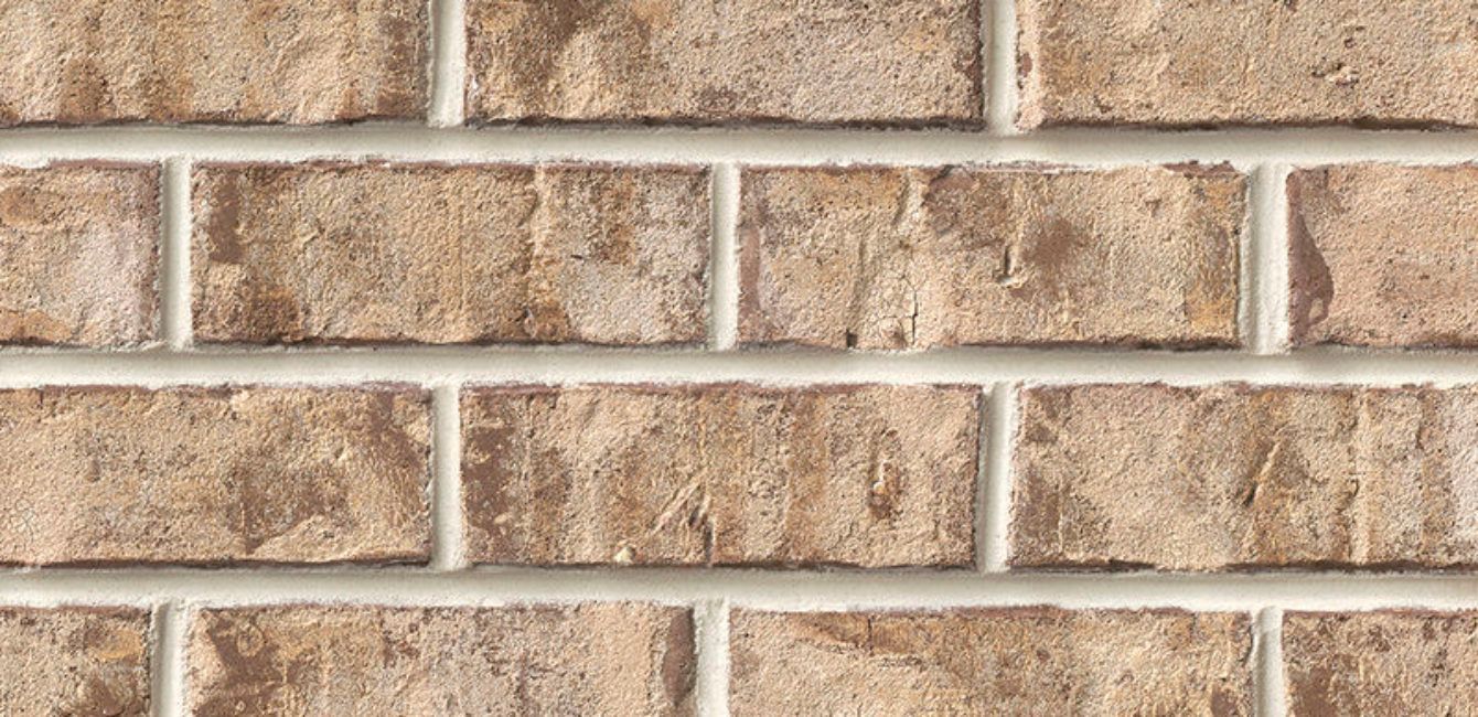 Old Biscayne brick features a warm blend of soft beige, sandy buff, and light brown tones with subtle weathering for a naturally aged appearance. This buff brick delivers a light, inviting aesthetic that complements coastal, traditional, and modern home designs, making it a versatile choice for exterior facades, accent walls, and architectural details.