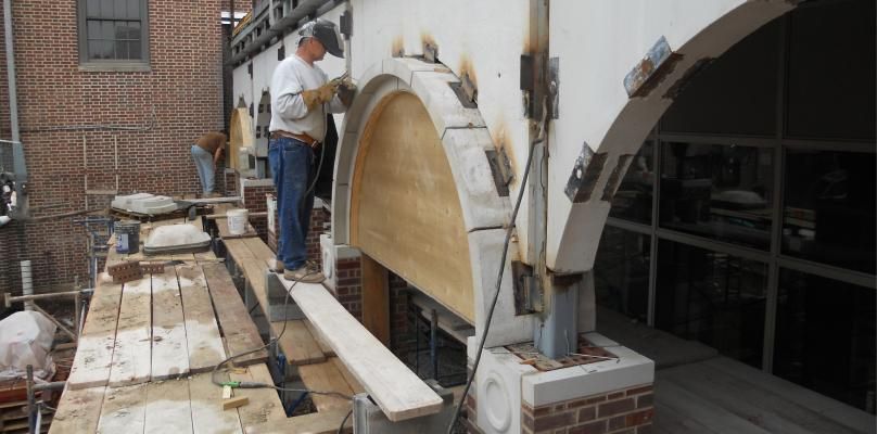 Reading Rock is the only company in the cast stone industry that can combine all components, wet and dry, of cast stone to make it appear as if it was all manufactured the same way. This is made possible by advanced and innovative color blending methods monitored by in-house experts. Reading Rock provides unlimited design options regarding cast stone that combines old world craftsmanship and low maintenance, giving George Washington the flexibility to match the designs of both buildings. Cast stone products such as base panels, medallions, caps and bands blend decoration and functionality for a great final product.